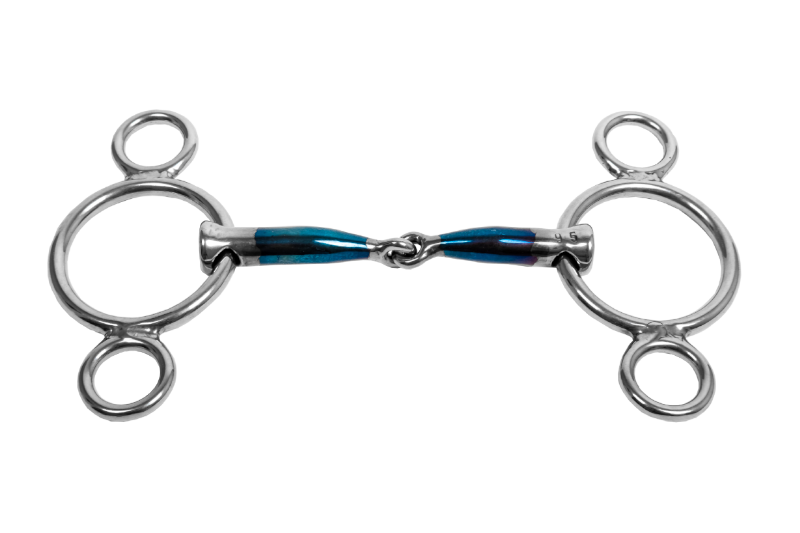 The 2½ & 3 Ring, also known as a Pessoa bit, features extra rings at the top and bottom of the regular bit rings. The top ring is used to attach the cheekpiece, while the bottom ring is for the rein. When the rein is used, the top ring tilts forward, creating leverage.